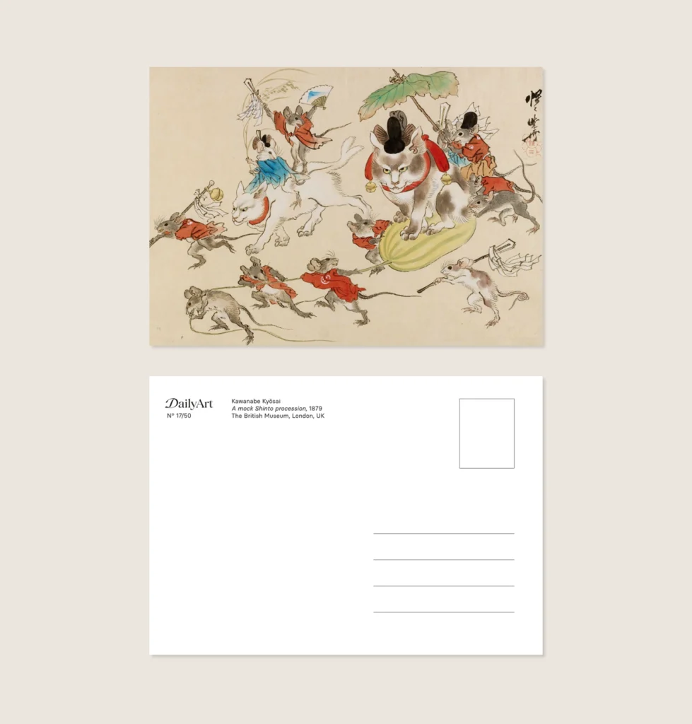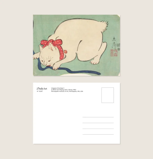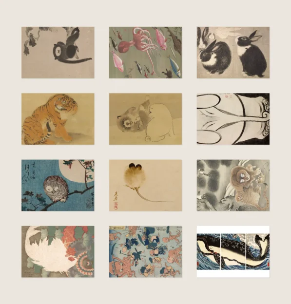 Animals in Japanese Art is a beautiful collection of 50 postcards featuring animals as seen by the Japanese masters — from delicate ink paintings to bold ukiyo-e prints.The set includes works by artists such as Itō Jakuchū, known for his vivid and almost surreal depictions of birds and sea creatures, and Utagawa Hiroshige, whose owls, foxes, cats, and festival scenes appear throughout the series, as well as dynamic and imaginative prints by Utagawa Kuniyoshi, including his expressive animal compositions.