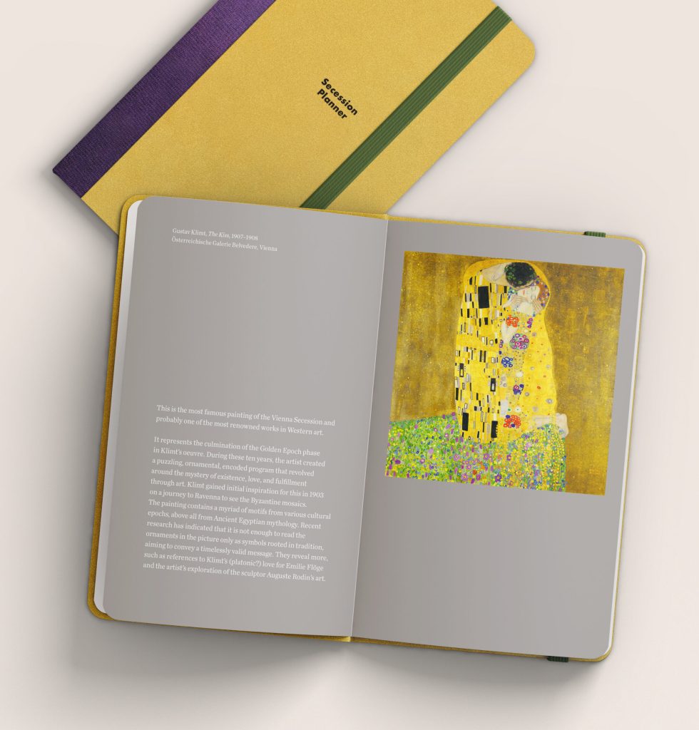 Printed in only 500 copies, its mission is to inspire you by the beauty of Vienna Secession's fantastic art, however you want to use it - whether at work or in your personal life. Now without predefined dates. Its elegantly structured ivory pages retain all the familiar features of a standard weekly planner, but with the flexibility of being undated. In addition, inside, you will find 12 reproductions of beautiful Viennese Secession masterpieces, created by artists like Gustav Klimt, Egon Schiele, Koloman Moser, and others, one for each month.