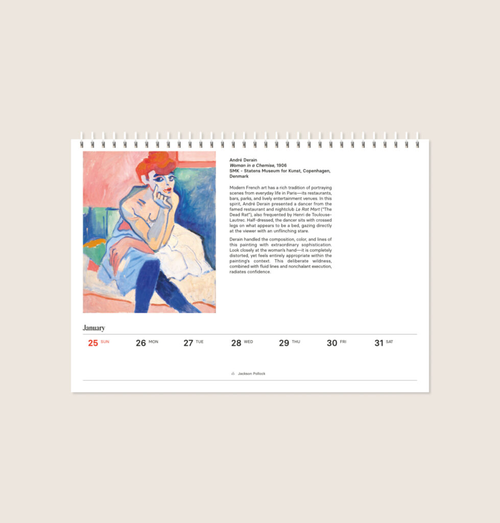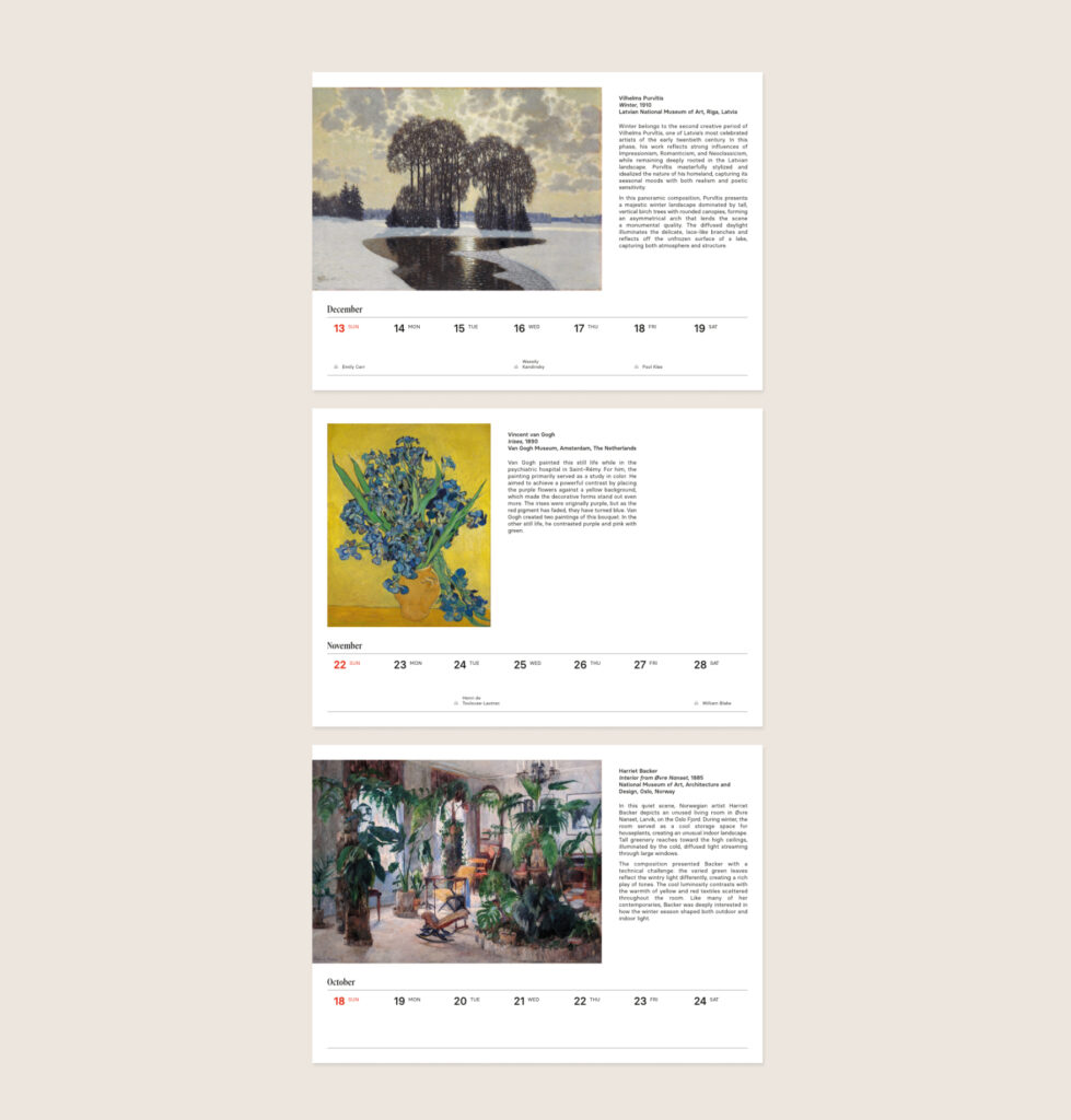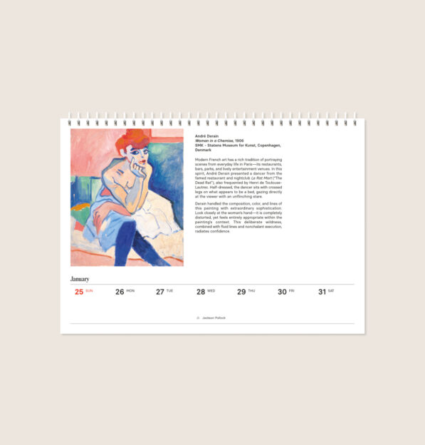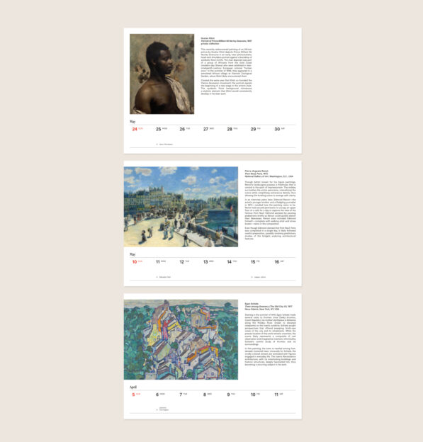 Among the artists featured in the calendar, you will find: Gustav Klimt, Egon Schiele, Katsushika Hokusai, Edgar Degas, Vincent van Gogh, and many more!