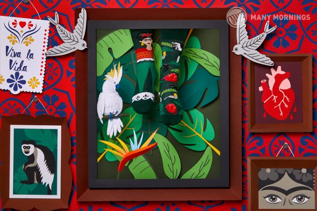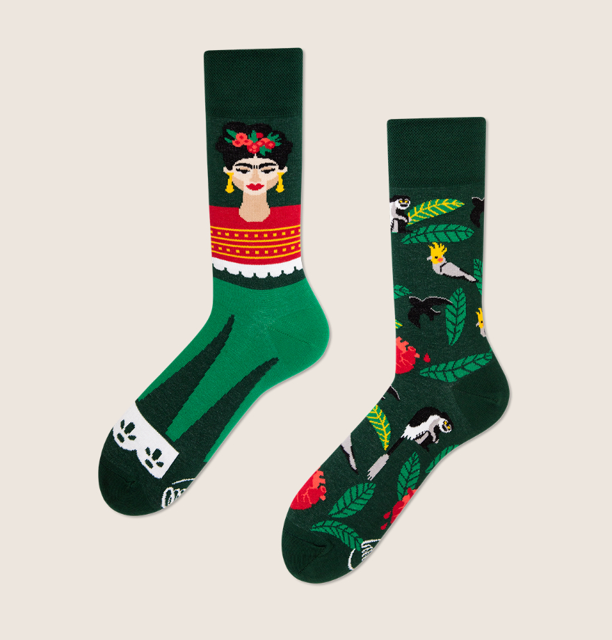 Frida Kahlo in her iconic artworks were inspired by the nature and artifacts of Mexico. Her paintings often had strong autobiographical elements and mixed realism with fantasy. These socks match in green, white, and red and show Frida’s face (with a famous unibrow!), plants, animals, and a bleeding heart motif, which gives these socks a visually rich design.