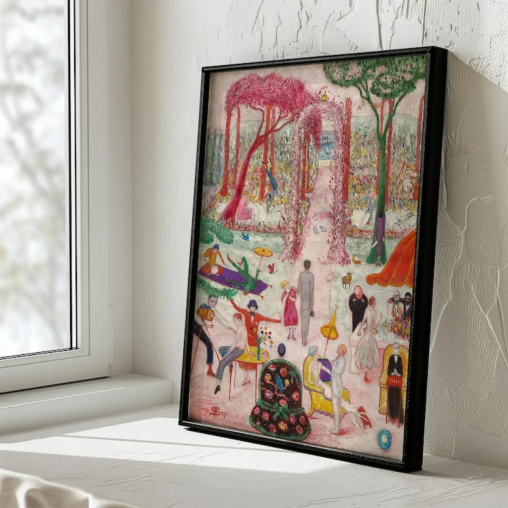 In this lively outdoor scene, elegantly dressed figures relax and socialize in a sunlit countryside setting. The composition is filled with whimsical details—bright colors, stylized forms, and decorative patterns—that reflect Stettheimer’s distinctive blend of modernism and theatricality. Rather than striving for strict realism, she presents the moment almost like a stage set, where each figure contributes to the rhythm and storytelling of the scene.