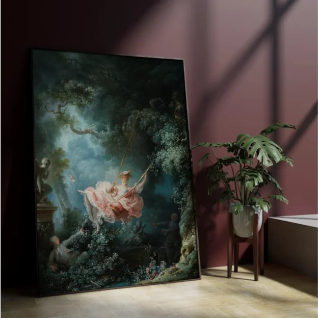 Playful, romantic, and delightfully theatrical, The Swing by Jean-Honoré Fragonard captures the spirit of the Rococo era at its most exuberant. Commissioned by a French nobleman who wished to be secretly included in the scene, the painting embodies the lighthearted indulgence and flirtatious charm that defined aristocratic life in 18th-century France.